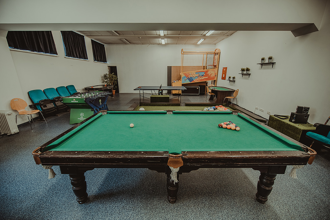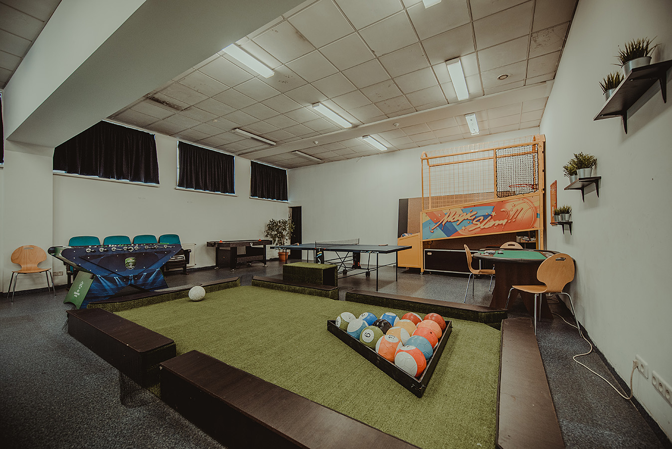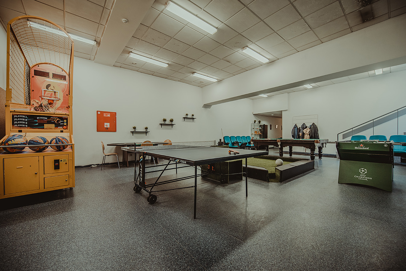 stalo futbolą, stalo tenisą, pulo stalą, krepšinio aparatą, oro ritulį, kojų pulą bei pokerio stalą.